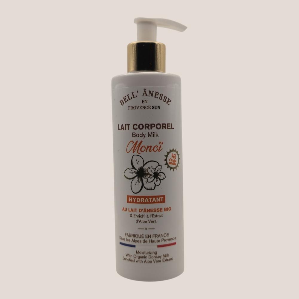 Lait corporel à l’huile de monoï en y ajoutant les propriétés du lait d’ânesse bio et enrichi en beurre de Karité.